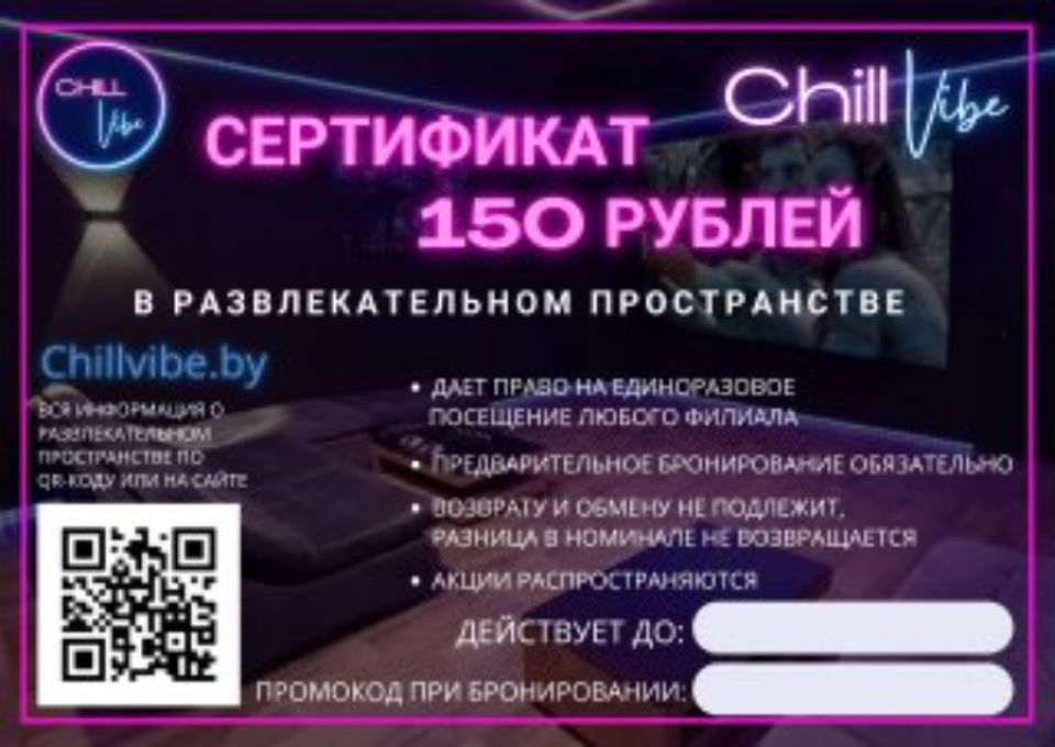 ПОДАРОЧНЫЙ СЕРТИФИКАТ В РАЗВЛЕКАТЕЛЬНОЕ ПРОСТРАНСТВО СHILL VIBE